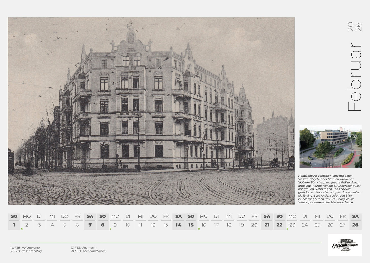 Unser Kalender „Machdeburch anno knips“ ist ein einzigartiger Rückblick auf 14 Seiten auf eine unzerstörte Stadt der Postkartenmotive. Der Vergleich zur heutigen Bebauung schockiert. Dies bestärkt sich auf jeder Seite durch einen eindrucksvollen Bildvergleich von anno knips mit unseren Tagen. Dazu gibt es jeweils einen kompetenten aussagekräftigen Text, der die Szenerie treffend beschreibt.