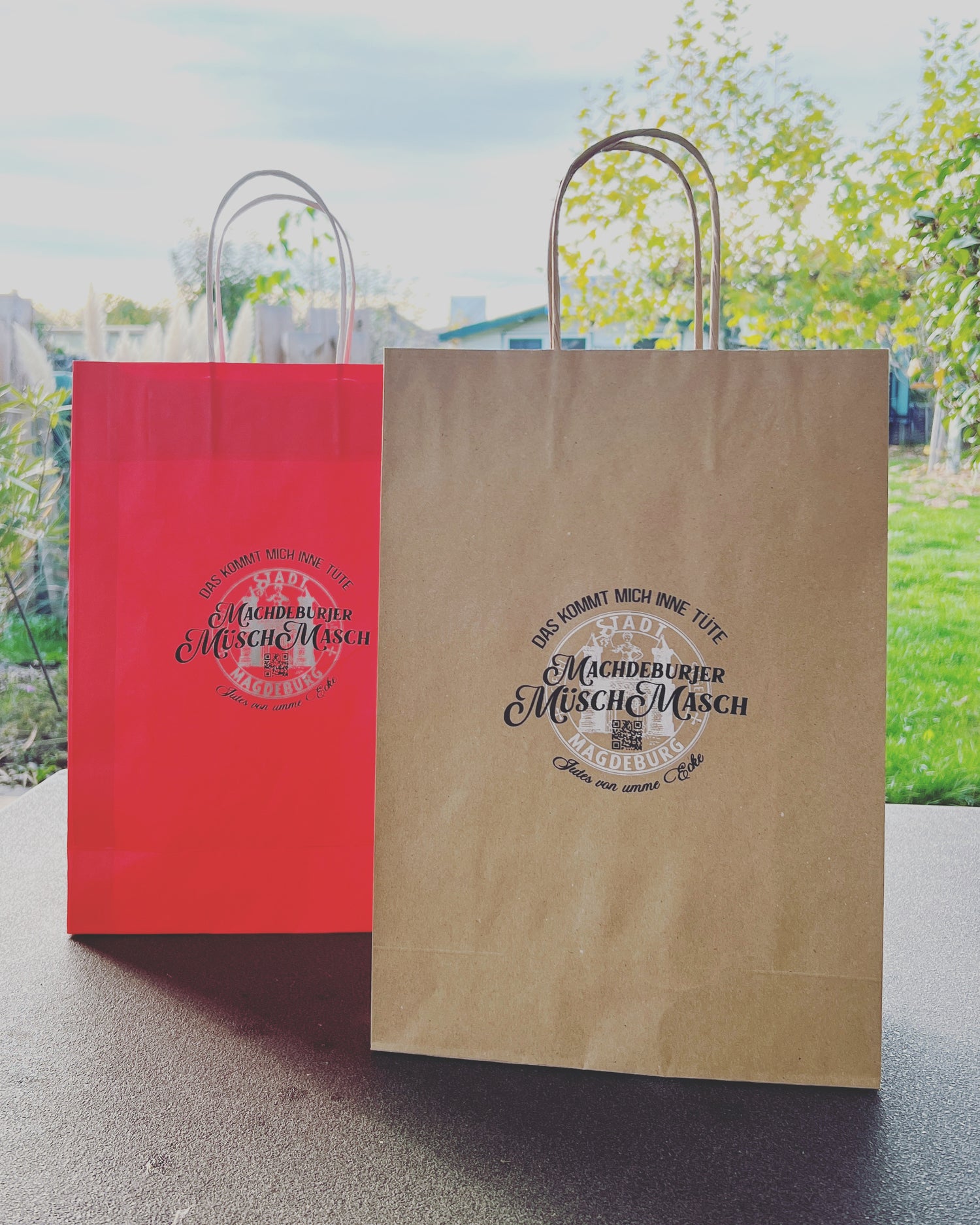 Unsere Machdeburjer Geschenktüte hat den Aufdruck in herrlichster Mundart „Das kommt mich inne Tüte“ und „Machdeburjer Müsch-Masch“. Die Tüten gibts in grau und rot aus Papier.