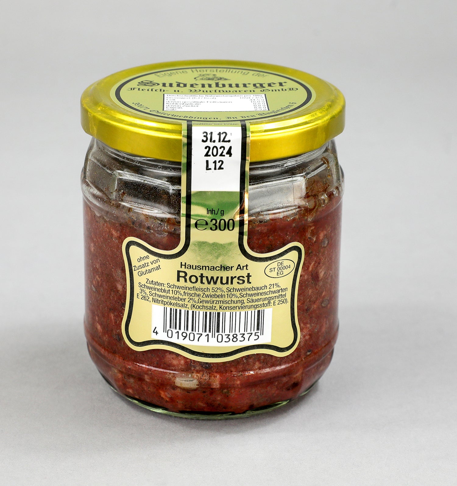 Zutaten: Schweinefleisch (52%), Schweinebauch (21%), Schweineblut (10%), frische Zwiebeln 10%, Schweineschwarten (3%), Schweineleber (2%), Gewürzmischung, Säuerungsmittel E262 (Kochsalz, Konservierungsstoff E250)